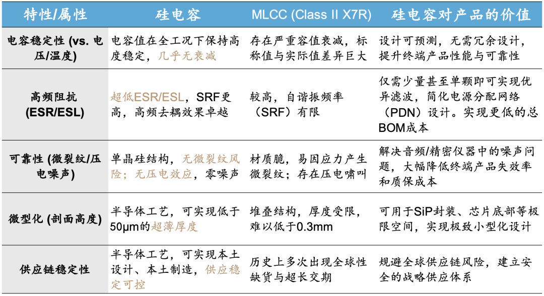 硅电容并非对MLCC的简单改良,而是一种基于半导体工艺的根本性技术革新。其优势体现在多个维度,直接解决了MLCC在高性能应用中长期存在的“隐性妥协”。在5G/6G通信、高速处理器(如AI、HPC)的电源分配网络 (PDN)、汽车电子(如ADAS、BMS)、医疗设备(植入式与体外诊断)等高端领域,硅电容正快速取代传统MLCC,通过减少所需元件数量或提升系统整体可靠性,成为新一代电子系统的“性能心脏”。