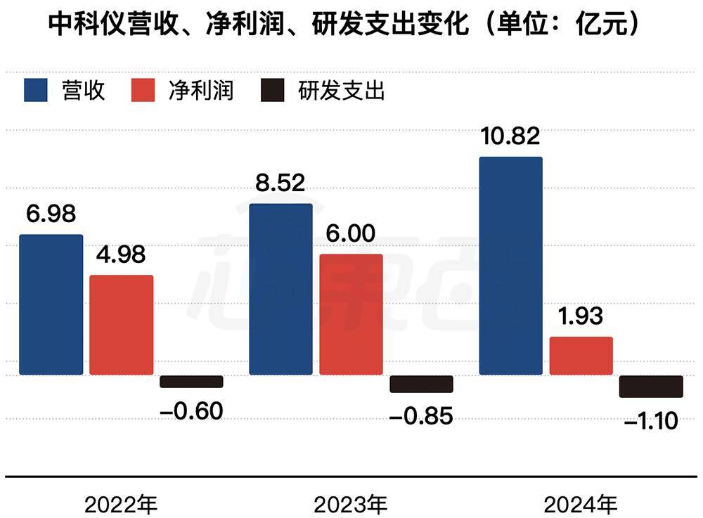 2022年、2023年、2024年,中科仪的营收分别为6.98亿元、8.52亿元、10.82亿元,净利润分别为4.98亿元、6.00亿元、1.93亿元,研发费用分别为0.60亿元、0.85亿元、1.10亿元。