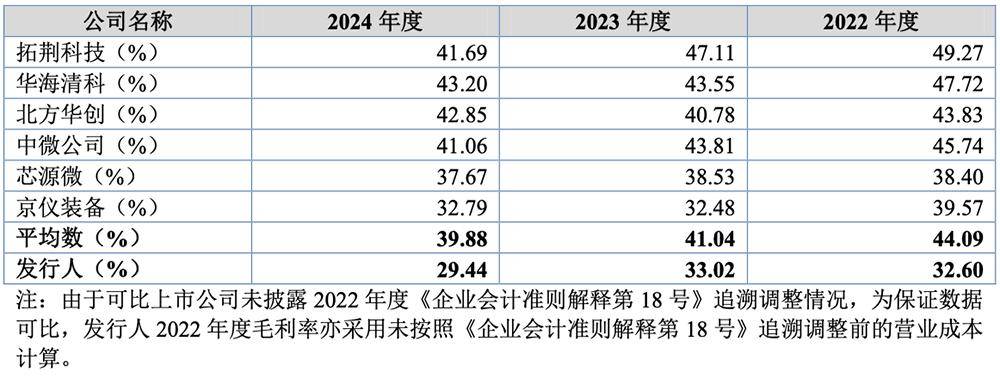 2022年、2023年、2024年,中科仪的综合毛利率分别为 32.60%、33.02%、29.44%,低于同行业上市公司,主要原因是拓荆科技、华海清科、北方华创、中微公司均从事半导体核心设备的研发生产和销售,议价能力相较中科仪更强,产品毛利率相对较高;与中科仪产品在半导体产线应用场景较为相像的上市公司为京仪装备,毛利率无显著差异。