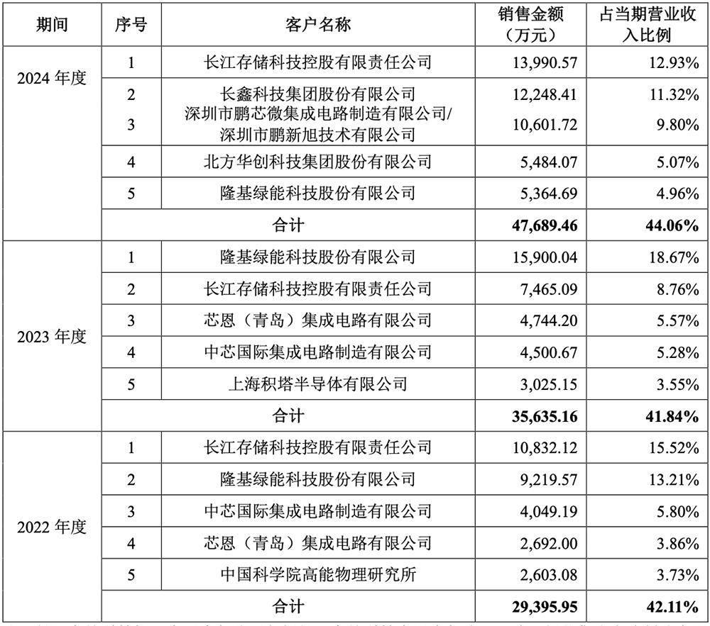 2022年、2023年、2024年,中科仪向前五名客户的销售金额分别占当期营收的42.11%、41.84%、44.06%,不存在向单个客户的销售比例超过总额50%的情形,也不存在严重依赖于少数客户的情形。