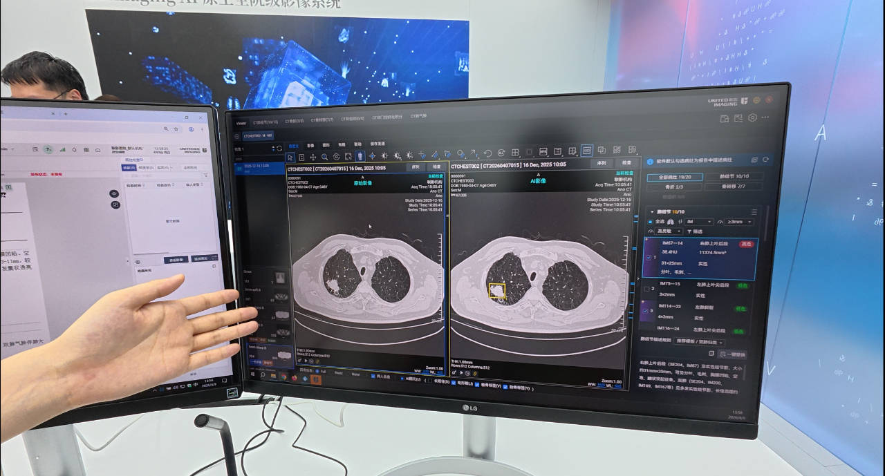 一台普通的电脑屏幕前,许多人挤在一起,盯着屏幕上的一张肺部CT影像。不到10秒,系统自动圈出了所有结节、炎症和疑似早期肿瘤的病灶,旁边同步生成了一份结构清晰的诊断报告。这是在联影集团展出的uAI MedTuring胸部/脑部一扫多查智能体。
