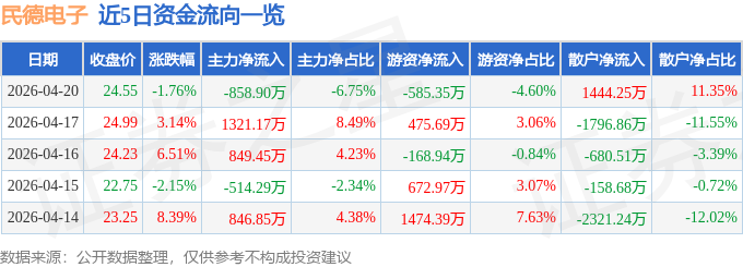 证券之星消息,截至2026年4月20日收盘,民德电子(300656)报收于24.55元,下跌1.76%,换手率3.87%,成交量5.14万手,成交额1.27亿元。