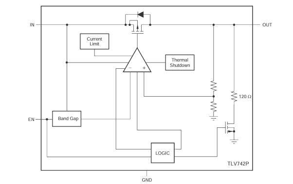 TLV742P 具备有源输出放电特性,有助于在系统处于禁用状态、待机模式或睡眠模式时确保输出保持低电平。此外,该器件的过流保护功能可在输出短路的情况下保护器件,并且其热关断功能可防止过热。