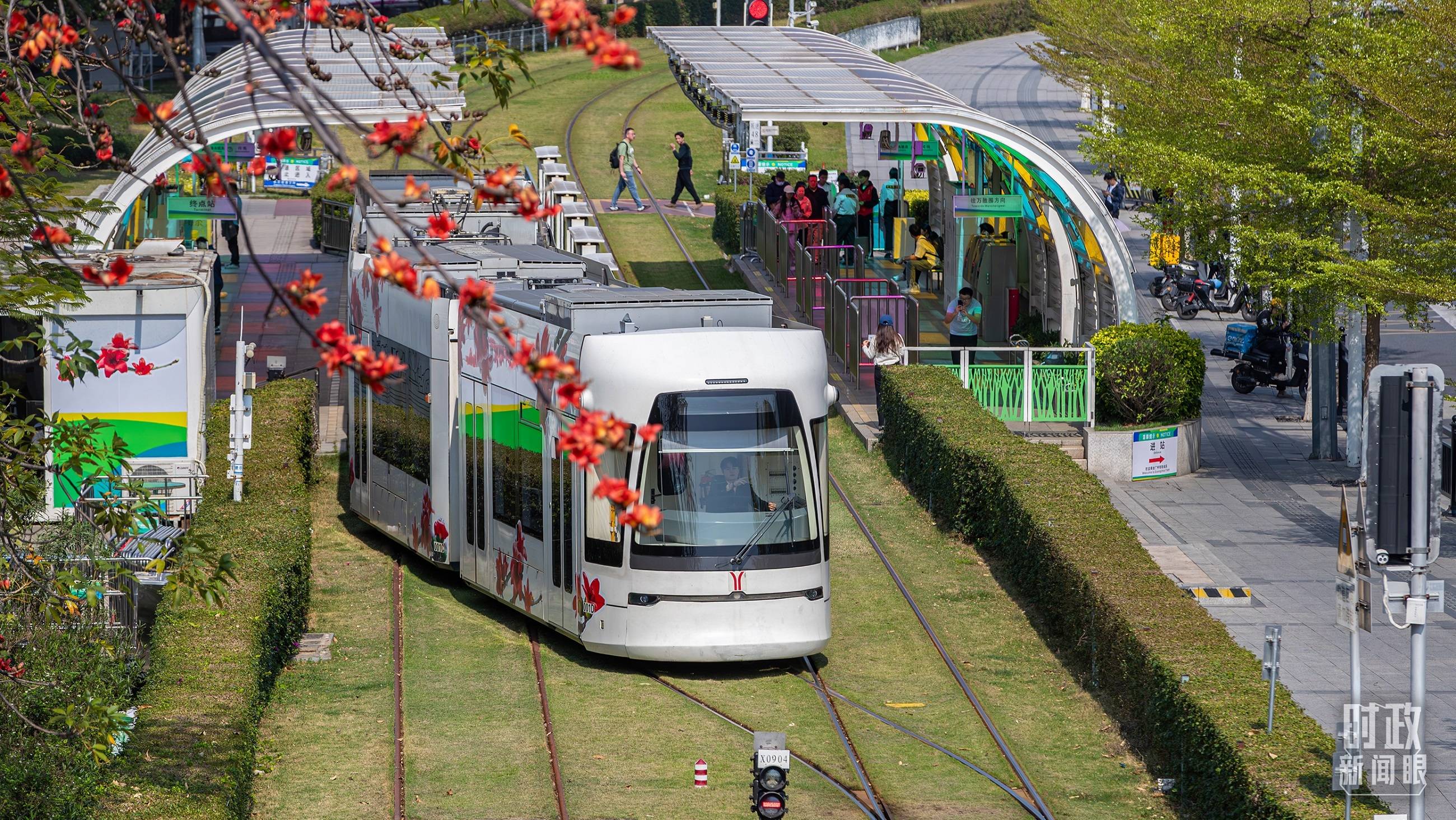 △广州阅江路,有轨电车从木棉花下驶过。(图/视觉中国)
