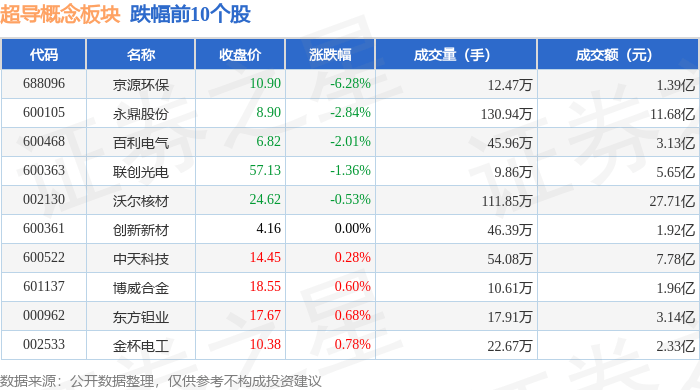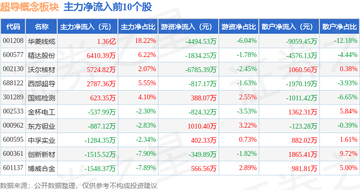 从资金流向上来看,当日超导概念板块主力资金净流出1.89亿元,游资资金净流出7428.94万元,散户资金净流入2.64亿元。超导概念板块个股资金流向见下表: