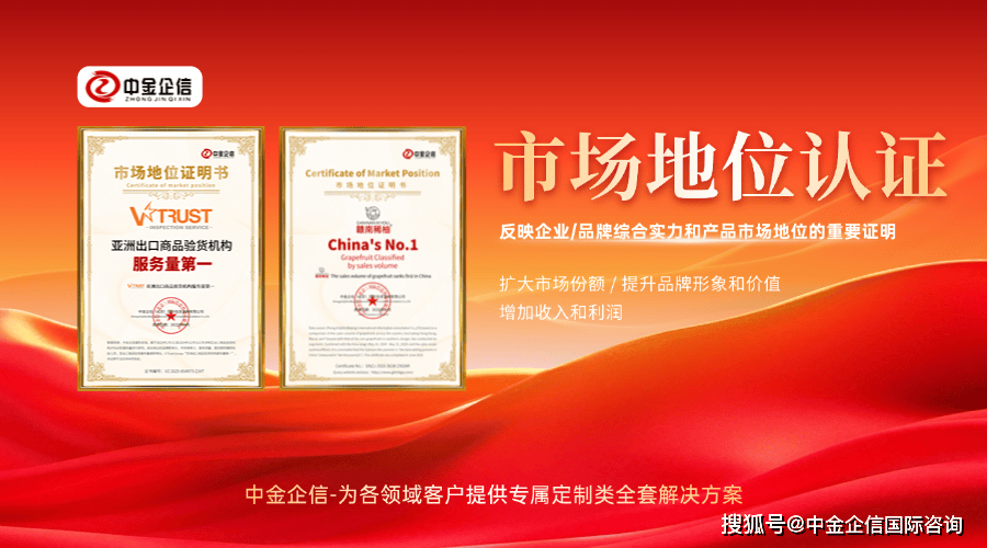 市场地位认证是企业市场策略的重要组成部分。通过科学的认证策略和严格的实施步骤,企业不仅能够提升自身的市场地位,还能够在激烈的市场竞争中占据有利地形。随着全球化的不断深入,市场地位认证将成为企业国际化战略的重要支点,帮助企业在全球市场中赢得尊重和认可。中金企信国际咨询深耕市场调研16年,为国内外各领域提供市场地位占有率认证&证明、市场占有率认证&证明、国产化率证明、进入性研究、市场调查、资信/信用报告、品牌价值评估报告、数据分析、项目可行性&商业计划书、行业研究等全套解决方案的独立第三方咨询服务机构。已成为各领域企业、政府部门、团体组织、各大科研院所等政界、学界、商界多位一体的综合性咨询平台,是国内外领先的多元化咨询服务提供商之一。