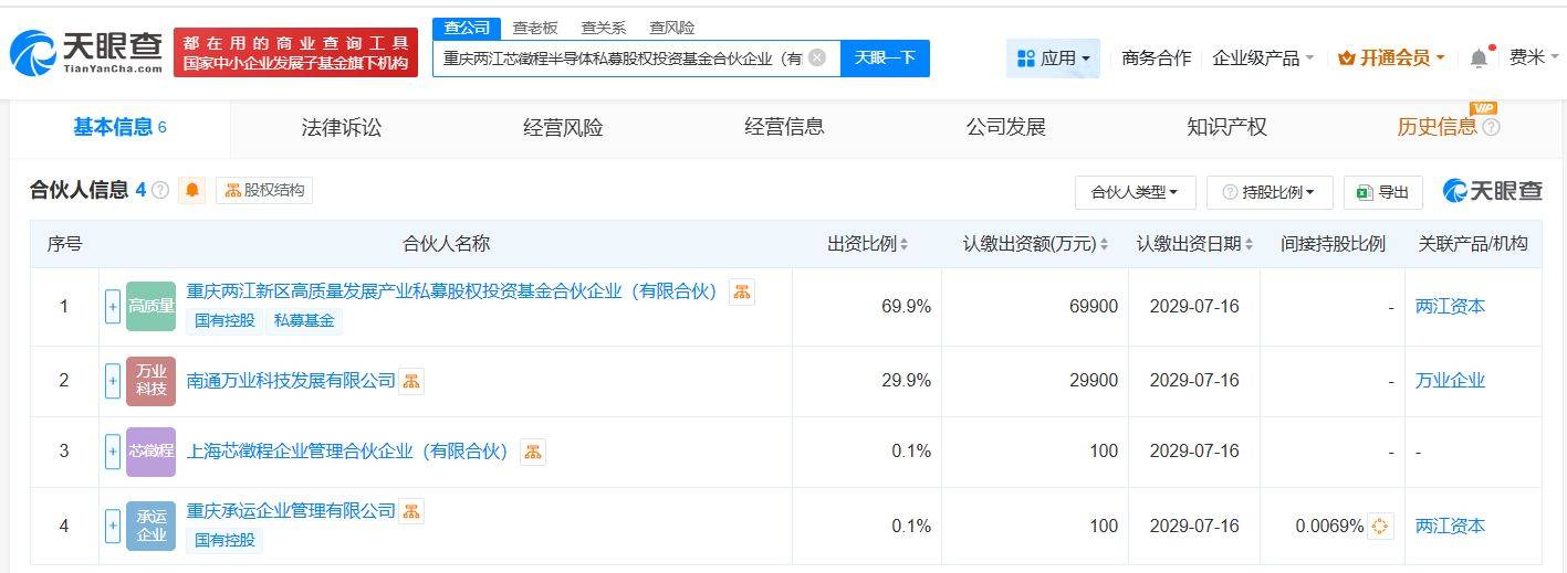 天眼查App显示,近日,重庆两江芯徵程半导体私募股权投资基金合伙企业(有限合伙)成立,执行事务合伙人为重庆承运企业管理有限公司、上海芯徵程企业管理合伙企业(有限合伙),出资额10亿人民币,经营范围为以私募基金从事股权投资。合伙人信息显示,该基金由重庆两江新区高质量发展产业私募股权投资基金合伙企业(有限合伙)、南通万业科技发展有限公司、上海芯徵程企业管理合伙企业(有限合伙)、重庆承运企业管理有限公司共同出资。