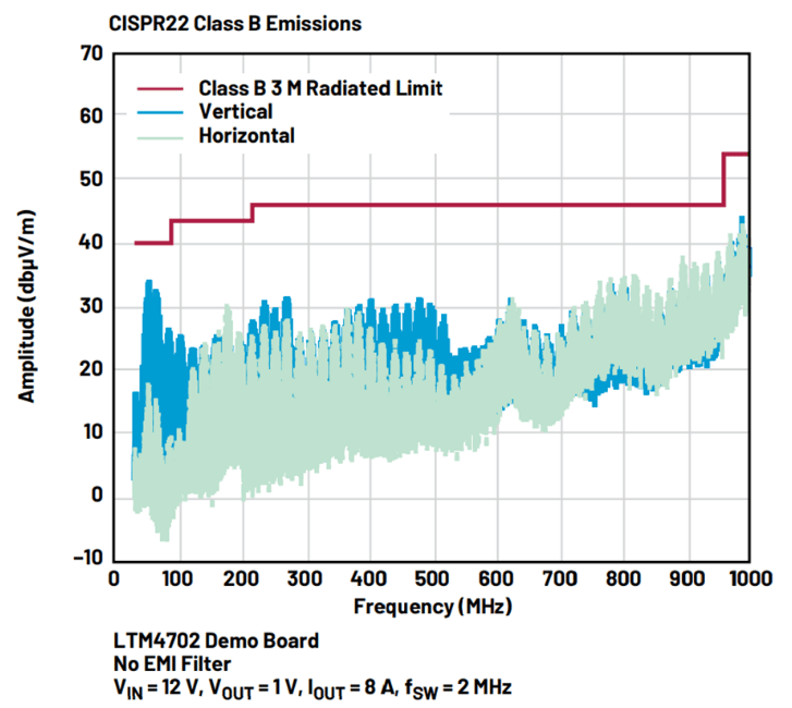LTM4702具备超低噪声架构,能够实现出色的低频(< 100 kHz)输出噪声性能。仅需配置一个电阻,即可完成输出电压的设定,在整个输出电压范围内实现单位增益操作,从而使得输出噪声几乎保持恒定,不受输出电压波动的影响。图3展示了辐射EMI性能。