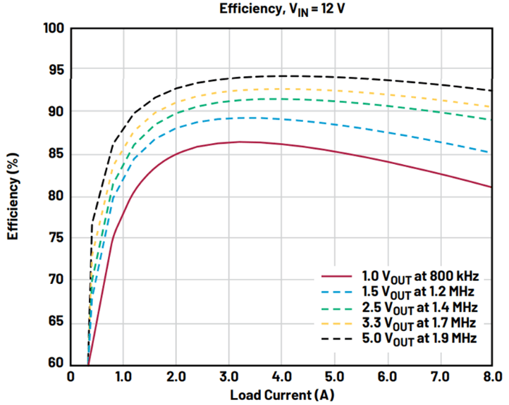 图2. 效率与负载电流的关系 (VIN= 12 V)。
