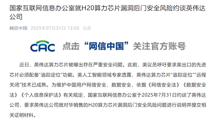 说白了,不管是国外的芯片还是操作系统,想要进入我国市场,就必须严格遵守我国相关法律法规,彻底把安全漏洞和后门都堵上。因此,国家网信办才会在7月31日果断亮剑,对英伟达进行约谈,要求它对H20后门疑云进行详细说明。