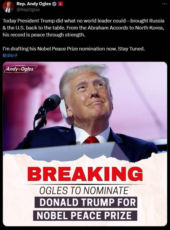 奥格尔斯写道:“今天,特朗普总统做到了其他任何一位世界领导人都做不到的事情——让俄罗斯和美国重回谈判桌……我正在起草他的诺贝尔和平奖提名。敬请期待。”