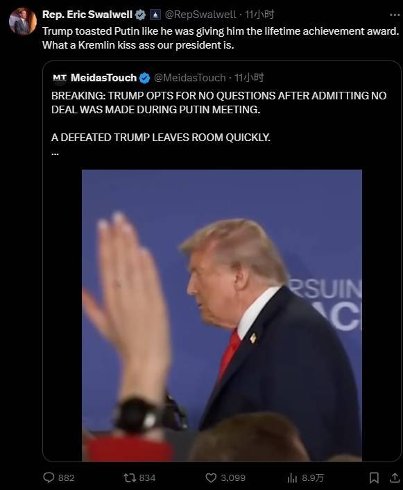 民主党官方X账户发文称,特朗普邀请普京“到美国领土上,只是为了让他出尽风头”。