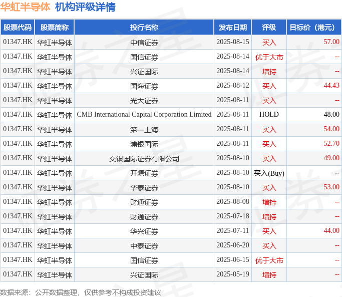 投行对该股的评级以买入为主,近90天内共有9家投行给出买入评级,近90天的目标均价为50.27港元。中信证券最新一份研报给予华虹半导体买入评级,目标价57港元。