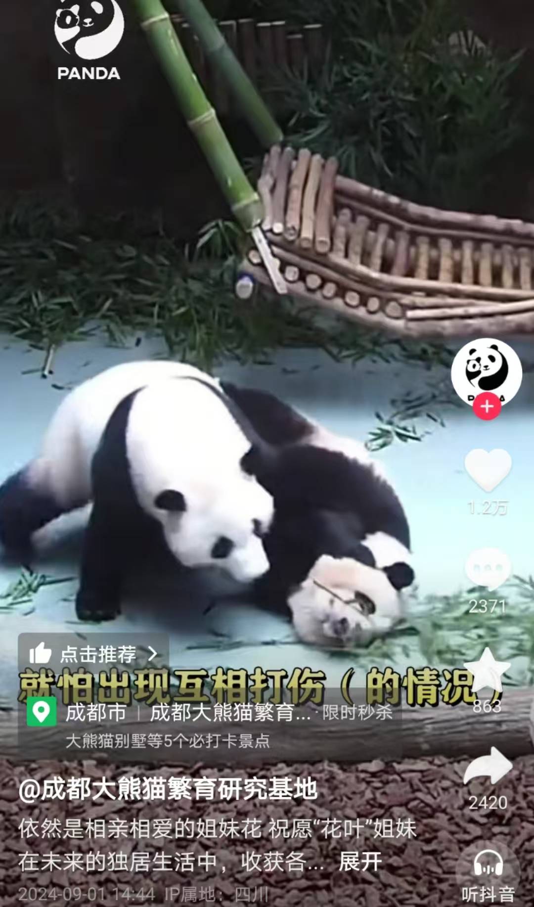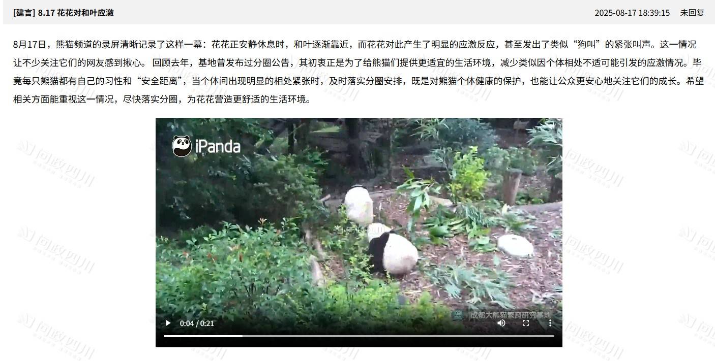 8月17日,网友发视频反映,在成都熊猫基地的网红大熊猫“和花”对正在靠近它的“和叶”出现应激反应,显得很排斥对方的靠近,引发很多网友担心,希望能落实分圈。