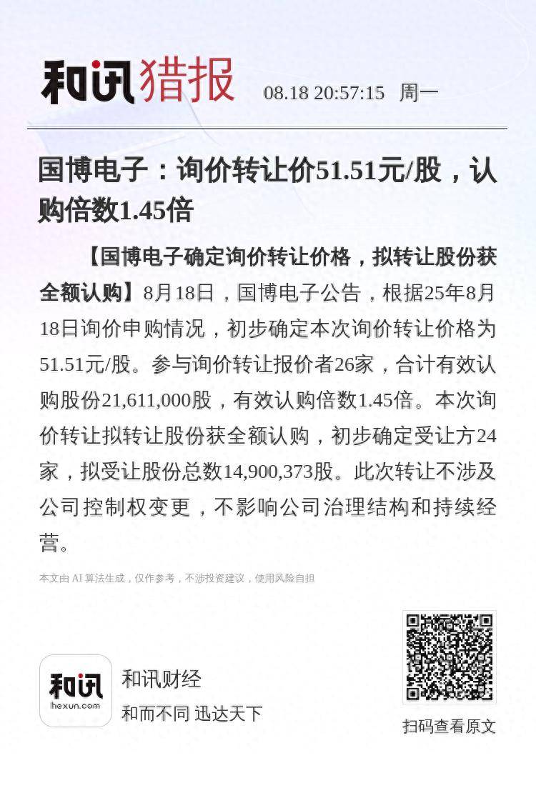 【国博电子确定询价转让价格,拟转让股份获全额认购】8月18日,国博电子公告,根据25年8月18日询价申购情况,初步确定本次询价转让价格为51.51元/股。参与询价转让报价者26家,合计有效认购股份21,611,000股,有效认购倍数1.45倍。本次询价转让拟转让股份获全额认购,初步确定受让方24家,拟受让股份总数14,900,373股。此次转让不涉及公司控制权变更,不影响公司治理结构和持续经营。