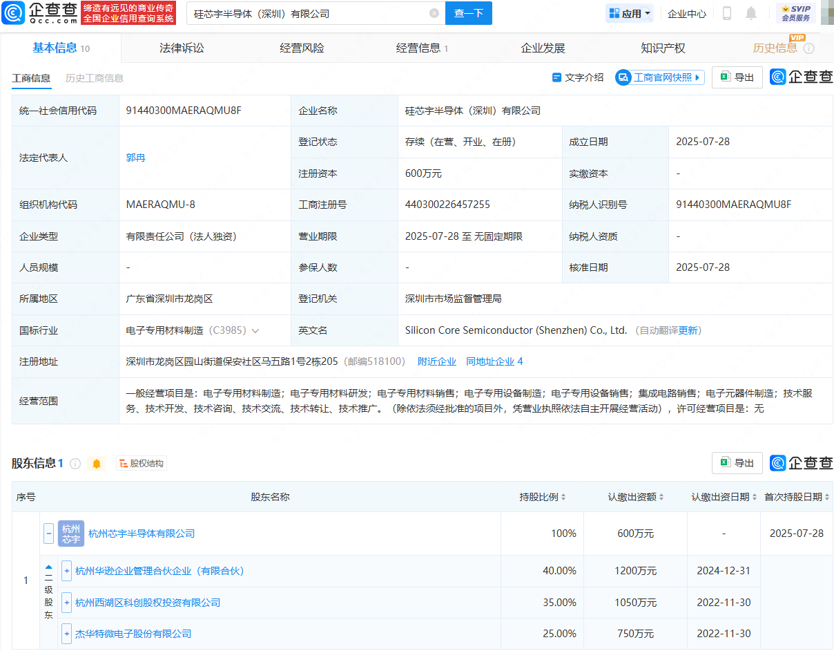 企查查APP显示,近日,硅芯宇半导体(深圳)有限公司成立,法定代表人为郭冉,经营范围包含:电子专用材料制造;电子专用材料研发;电子专用材料销售;集成电路销售;电子元器件制造等。企查查股权穿透显示,该公司由杭州芯宇半导体有限公司全资持股,后者由杰华特(688141)等共同持股。