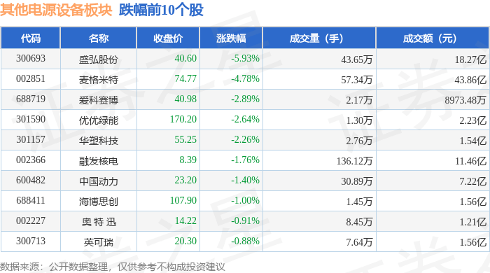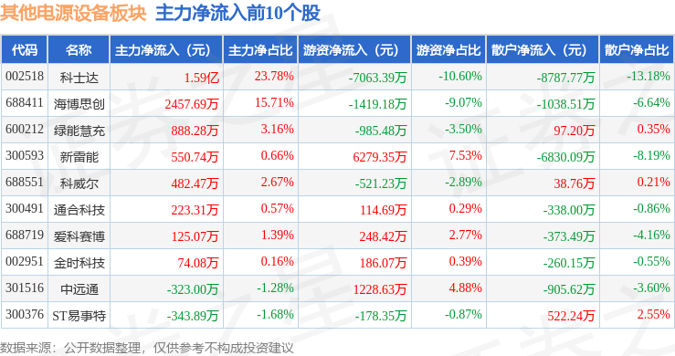 从资金流向上来看,当日其他电源设备板块主力资金净流出13.46亿元,游资资金净流入2.17亿元,散户资金净流入11.29亿元。其他电源设备板块个股资金流向见下表: