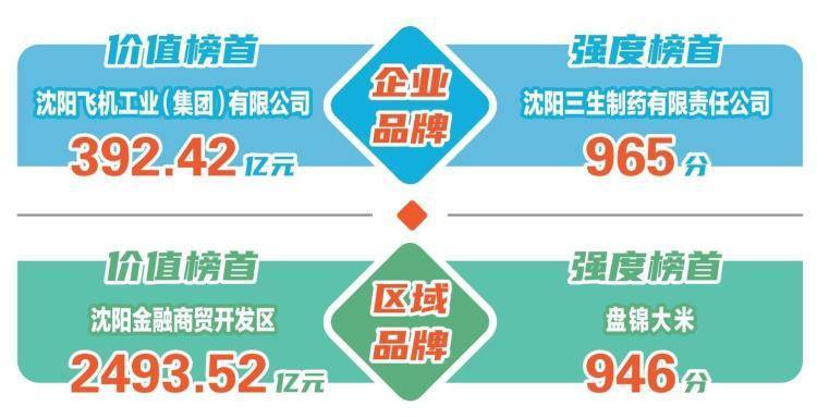 本次品牌价值评价分为机械设备制造、食品加工制造、能源化工、农业、生物医药、冶金材料等十七组。评价结果显示,今年参评企业品牌233个,品牌价值总和2812.65亿元;区域品牌29个,品牌价值总和7991.67亿元。企业品牌中,沈阳飞机工业(集团)有限公司以392.42亿元位于品牌价值榜首,沈阳三生制药有限责任公司以965分位于品牌强度榜首;区域品牌中,沈阳金融商贸开发区以2493.52亿元位于品牌价值榜首,盘锦大米以946分位于品牌强度榜首。