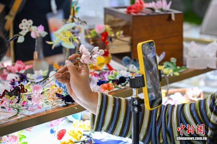 9月17日,参展商直播介绍绒花手工艺品。中新社记者 李嘉娴 摄