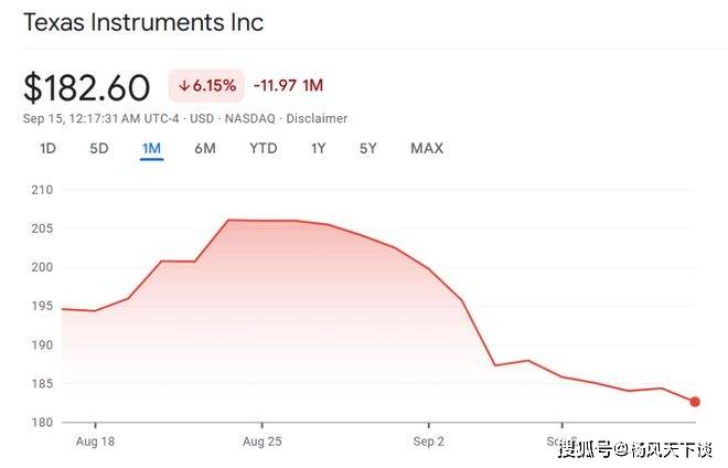 首先跟大家提一下,美国模拟芯片巨头是德州仪器(Texas Instruments, TI),股票代号是TXN。下图是 TXN 这一个月来的股价走势图。