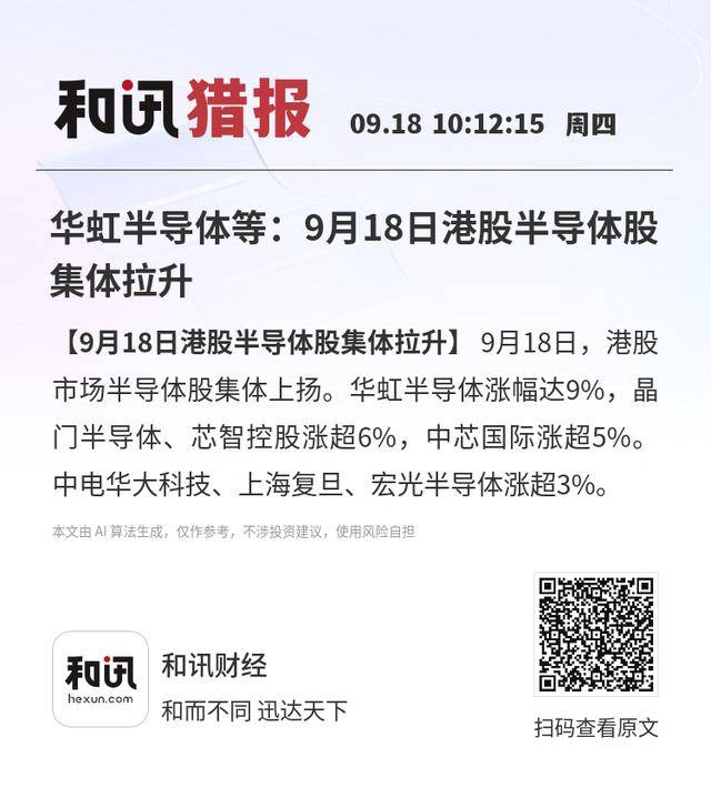 【9月18日港股半导体股集体拉升】9月18日,港股市场半导体股集体上扬。华虹半导体涨幅达9%,晶门半导体、芯智控股涨超6%,中芯国际涨超5%。中电华大科技、上海复旦、宏光半导体涨超3%。