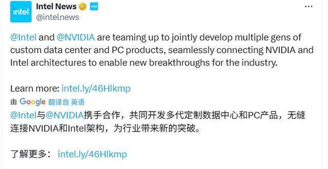 “几十年来,英特尔的x86架构一直是现代计算的基石——如今我们正在整个产品组合中不断创新,以支持未来的工作负载。英特尔领先的数据中心和客户端计算平台,再加上我们的工艺技术、制造与先进封装能力,将与英伟达在AI和加速计算上的领导地位相辅相成,从而为行业带来新的突破。我们感谢黄仁勋与英伟达团队对我们的信任与投资,并期待接下来的合作,为客户创新、推动业务增长。”