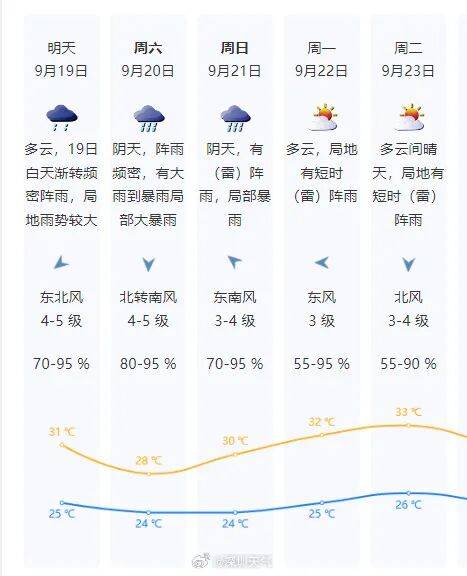 19日起,深圳阵雨增多,夜间至21日阵雨频密,累计雨量大雨到暴雨局部大暴雨,沿海高地和海区最大阵风8-10级;深汕有暴雨到大暴雨局部特大暴雨,最大阵风10-11级。
