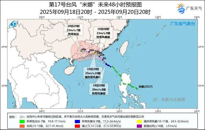 受“米娜”影响,19-20日,广东省将有一次暴雨到大暴雨局部特大暴雨过程,中东部沿海市县有7~10级阵风。18-19日,南海北部海面和广东省中东部海面风力自东向西加大至7~9级阵风10~12级。