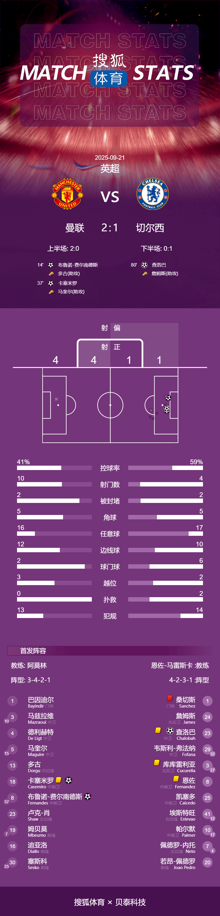 北京时间9月21日凌晨,2025/2026赛季英超联赛第5轮继续进行,“红魔”曼联坐镇老特拉福德迎战“蓝军”切尔西。开场5分钟切尔西门将桑切斯被直红罚下,B费和卡塞米罗前后完成破门,随后卡塞米罗吃到第二张黄牌被罚下。下半场,查洛巴头球扳回一分,最终10人曼联2-1战胜10人切尔西。