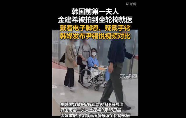 据环球网援引韩国媒体MBN新闻9月19日报道,韩国前第一夫人金建希9月18日被拍到穿着拘留所病号服坐轮椅就医。她戴着电子脚镣,双手被毛毯盖住,疑似戴着手铐。其律师团队称,就医原因为“严重低血压”。