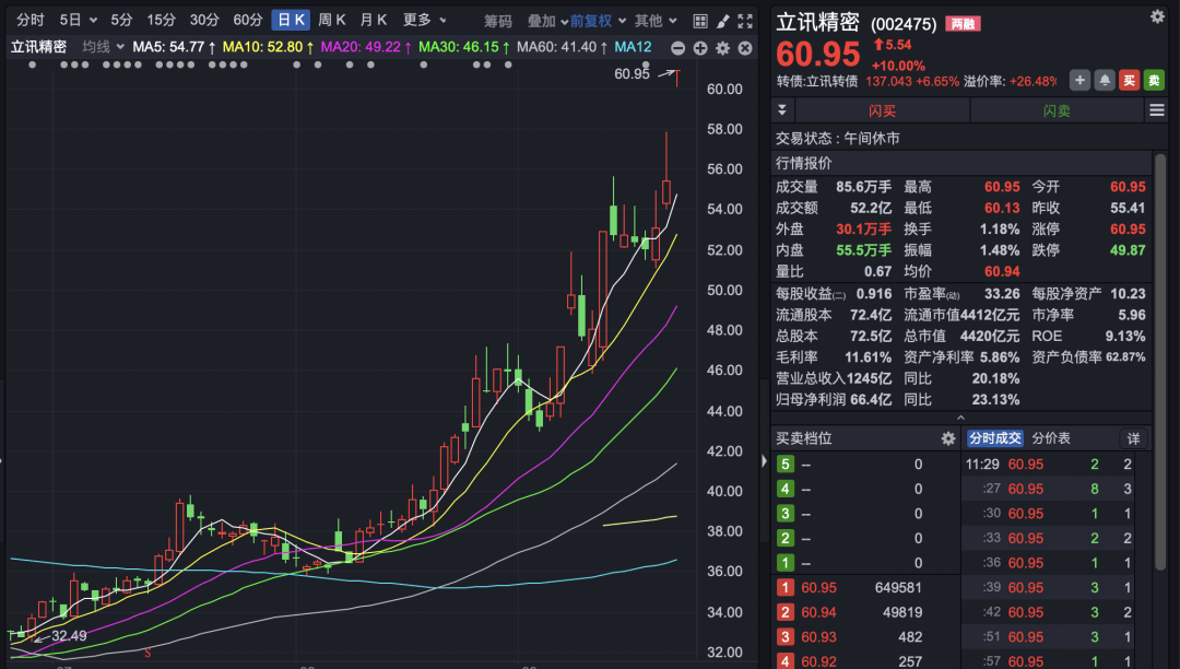 值得关注的是,消费电子龙头立讯精密早盘罕见一字涨停,最新市值4420亿元,最高封单金额超过46亿元,带动苹果概念股集体拉升。