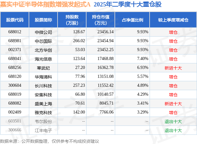 根据2025基金半年报公募基金重仓股数据,重仓该股的公募基金共30家,其中持有数量最多的公募基金为嘉实基金的嘉实中证半导体指数增强发起式A。嘉实中证半导体指数增强发起式A目前规模为2.12亿元,最新净值1.8104(9月22日),较上一交易日上涨3.23%,近一年上涨106.94%。该公募基金现任基金经理为刘斌。刘斌在任的基金产品包括:嘉实量化精选股票,管理时间为2015年12月7日至今,期间收益率为108.33%;嘉实沪深300指数研究增强A,管理时间为2021年3月27日至今,期间收益率为-11.95%;嘉实上证科创板50指数增强发起式A,管理时间为2022年12月20日至今,期间收益率为46.11%。