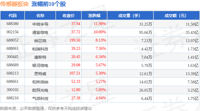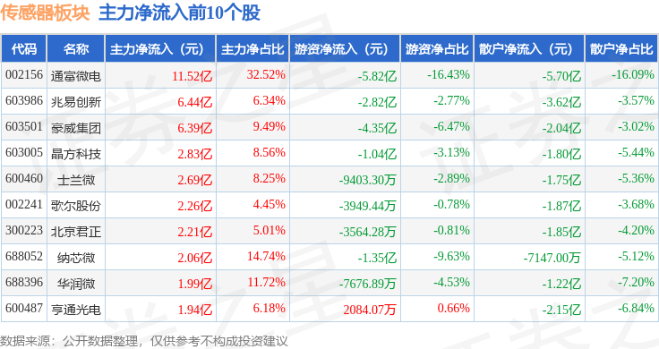 从资金流向上来看,当日传感器板块主力资金净流入44.16亿元,游资资金净流出25.6亿元,散户资金净流出18.56亿元。传感器板块个股资金流向见下表: