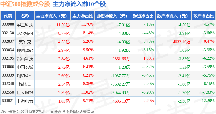 资金流向方面,中证500(000905)指数成份股当日主力资金净流出合计136.7亿元,游资资金净流入合计18.8亿元,散户资金净流入合计117.9亿元。成份股资金流向详情见下表: