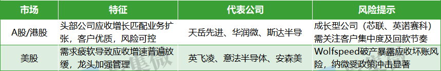 整体看,A股/港股公司应收账款增长总体健康,头部公司效率更优,成长型公司需警惕客户集中度过高带来的回款风险。美股公司行业周期底部特征明显,应收规模收缩或低增,Wolfspeed破产案例提示应收账款管理需结合客户信用风险动态评估。