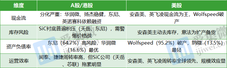 现金流与现金储备:A股、港股公司依托国内下游需求支撑,经营现金流普遍改善,现金储备充足,可支撑研发与产能扩张;美股公司除英飞凌外,多数企业经营现金流承压,部分公司需通过融资补充资金,Wolfspeed更是因现金流断裂申请破产,资金链稳定性远不及A股、港股企业。