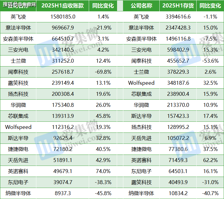 2025年上半年,美股第三代半导体公司应收账款增速普遍放缓,反映出全球市场需求疲软。英飞凌应收账款158.02亿元,同比增长1.4%,主要因公司在汽车电子领域订单增长放缓,且加强应收账款回收管理;意法半导体应收账款96.97亿元,同比下降21.9%,受半导体行业库存调整影响,下游客户采购需求减弱,应收规模同步收缩。