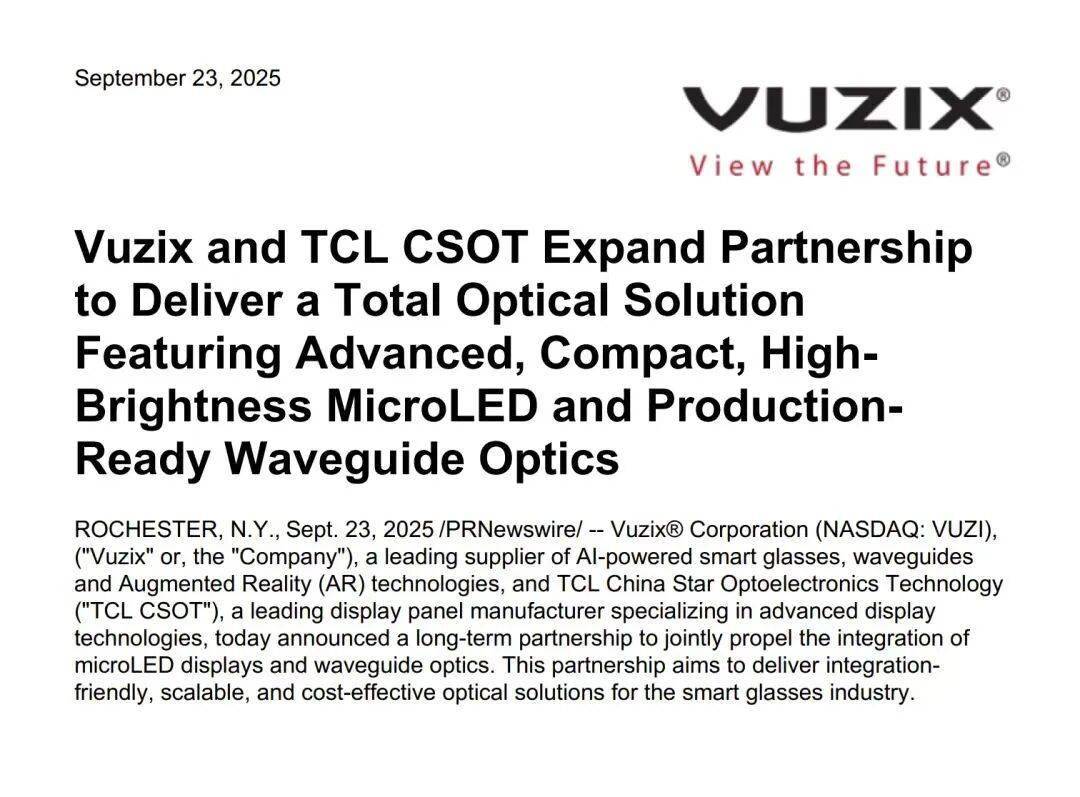 9月23日,智能眼镜与AR技术供应商Vuzix正式宣布与显示面板巨头TCL华星光电深化长期战略合作,双方将聚焦Micro LED微显示与光波导技术的融合创新,共同打造面向全球市场的完整光学显示解决方案,为AR行业商业化落地注入关键动力 。