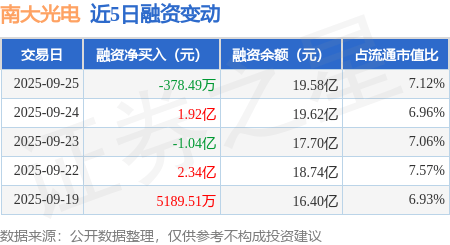 证券之星消息,9月25日,南大光电(300346)融资买入5.69亿元,融资偿还5.73亿元,融资净卖出378.49万元,融资余额19.58亿元,近20个交易日中有12个交易日出现融资净买入。