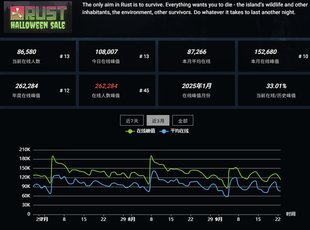 问世于2013年的Rust,凭借其高自由度的对抗体验和硬核生存玩法,成为生存对抗类游戏的重要标杆。时至今日,Rust都还是SOC市场最为成功的长青游戏之一,其Steam在线始终保持稳定,在国内也一度吸引了不少喜爱这类题材玩法的主播尝试。不过,由于延迟,沟通交流等原因,Rust在国内普通玩家群体当中一直扩圈不易。