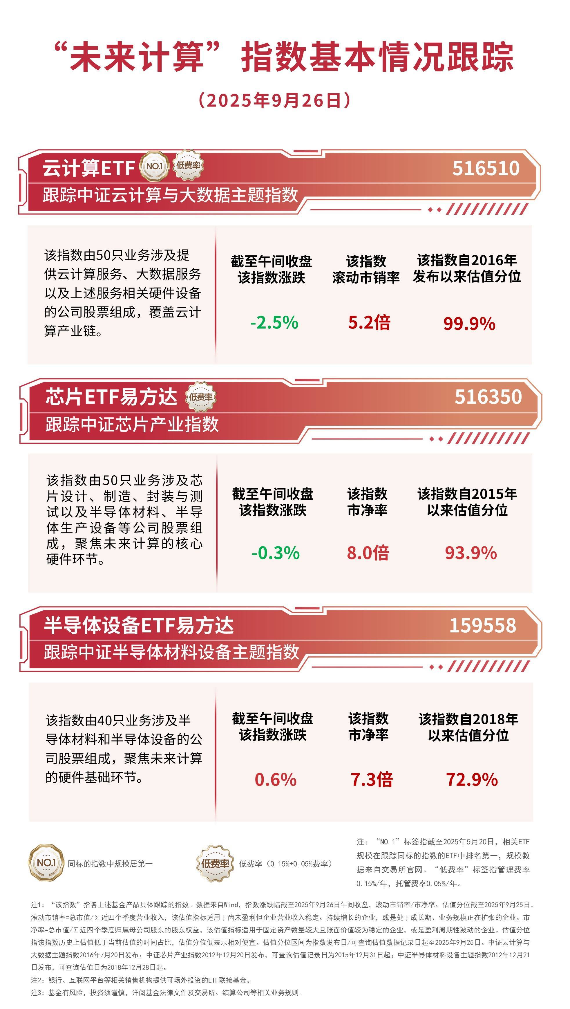 截至午间收盘,中证半导体材料设备主题指数上涨0.6%、盘中一度涨超2%,中证芯片产业指数下跌0.3%,中证云计算与大数据主题指数下跌2.5%,半导体设备ETF易方达(159558)半日获超1.2亿份净申购。