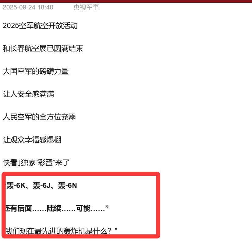 根据《央视军事》在2025年9月24日发布的关于长春航展的报道中,有一句看似“意味深长”,实则“泄露天机”的话。这其实是一名现场观众和空军轰炸机飞行员之间的对话,最后飞行员还有一句话:“大家拭目以待吧……”。这可把人的胃口拉的极大,难道传说中的“轰-20”战略隐轰即将现身?