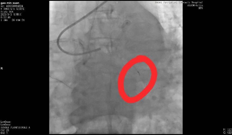 9月5日,高女士父亲在该医院做冠脉造影,手术进行了近3个小时。高女士回忆说,手术结束后,负责手术的医生告诉她,“在微创探查体内的时候,一截导丝断裂。”当高女士询问能否再次实施手术取出时,医生表示因病患年纪较大,开胸手术存在危险,并没有取出的必要。但对于遗留导丝会否在后续造成长期影响,该医生则称“无法确定”。