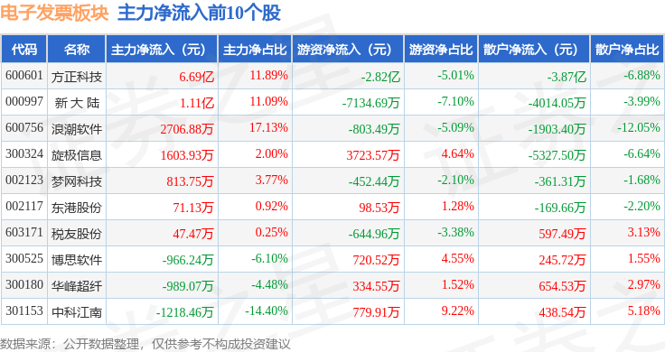 从资金流向上来看,当日电子发票板块主力资金净流入6.45亿元,游资资金净流出3.05亿元,散户资金净流出3.4亿元。电子发票板块个股资金流向见下表: