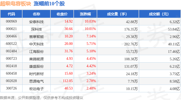 证券之星消息,10月9日超级电容板块较上一交易日上涨2.02%,安泰科技领涨。当日上证指数报收于3933.97,上涨1.32%。深证成指报收于13725.56,上涨1.47%。超级电容板块个股涨跌见下表: