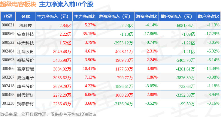 从资金流向上来看,当日超级电容板块主力资金净流出5.98亿元,游资资金净流入1.11亿元,散户资金净流入4.87亿元。超级电容板块个股资金流向见下表: