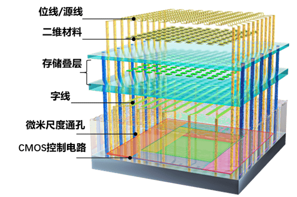 二维-硅基混合架构闪存芯片结构示意图,包含二维模块、CMOS控制电路和微米尺度通孔
