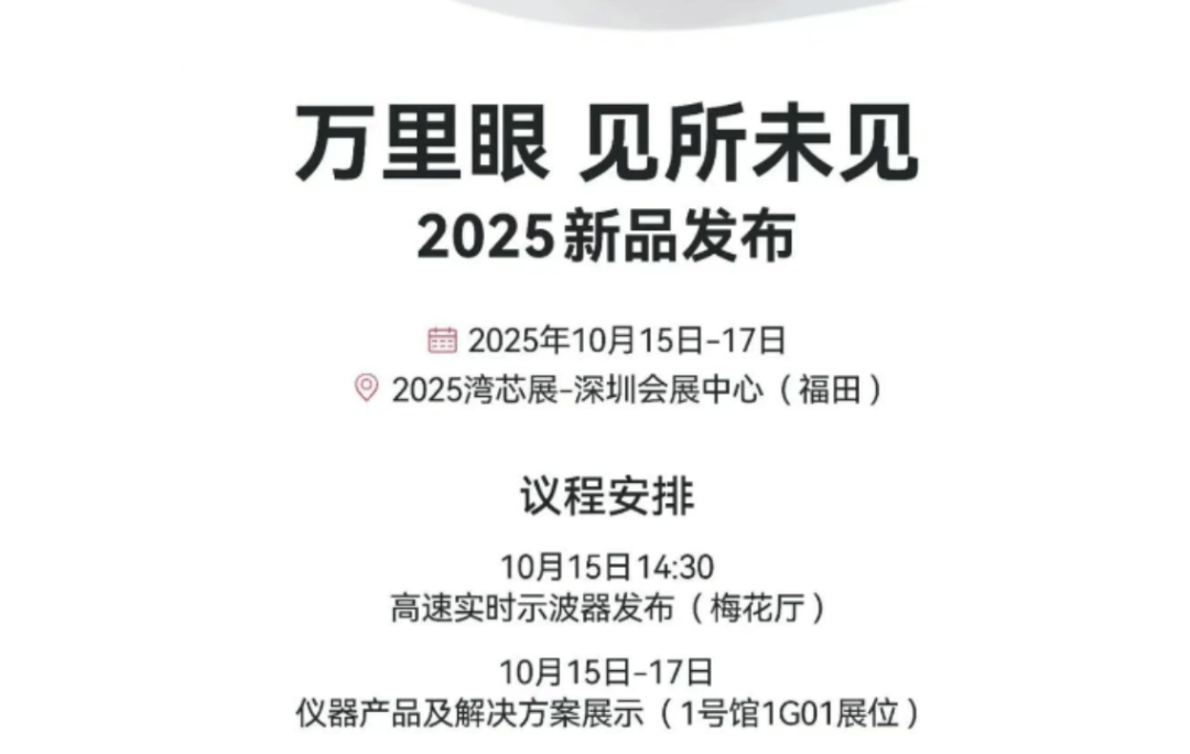 记者从微信公众号“万里眼Longsight”获悉,新凯来旗下子公司深圳市万里眼技术有限公司将在本届湾芯展上发布高速实时示波器,并展示仪器产品及解决方案。