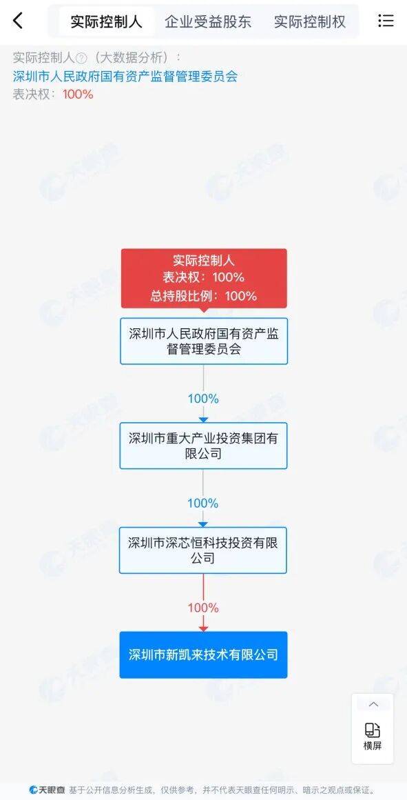 天眼查显示,新凯来总部位于深圳龙岗区平湖街道,成立于2021年8月,注册资本15亿元,是深圳市重大产业投资集团成员。记者通过股权穿透发现,新凯来由深圳市国资委100%控股。