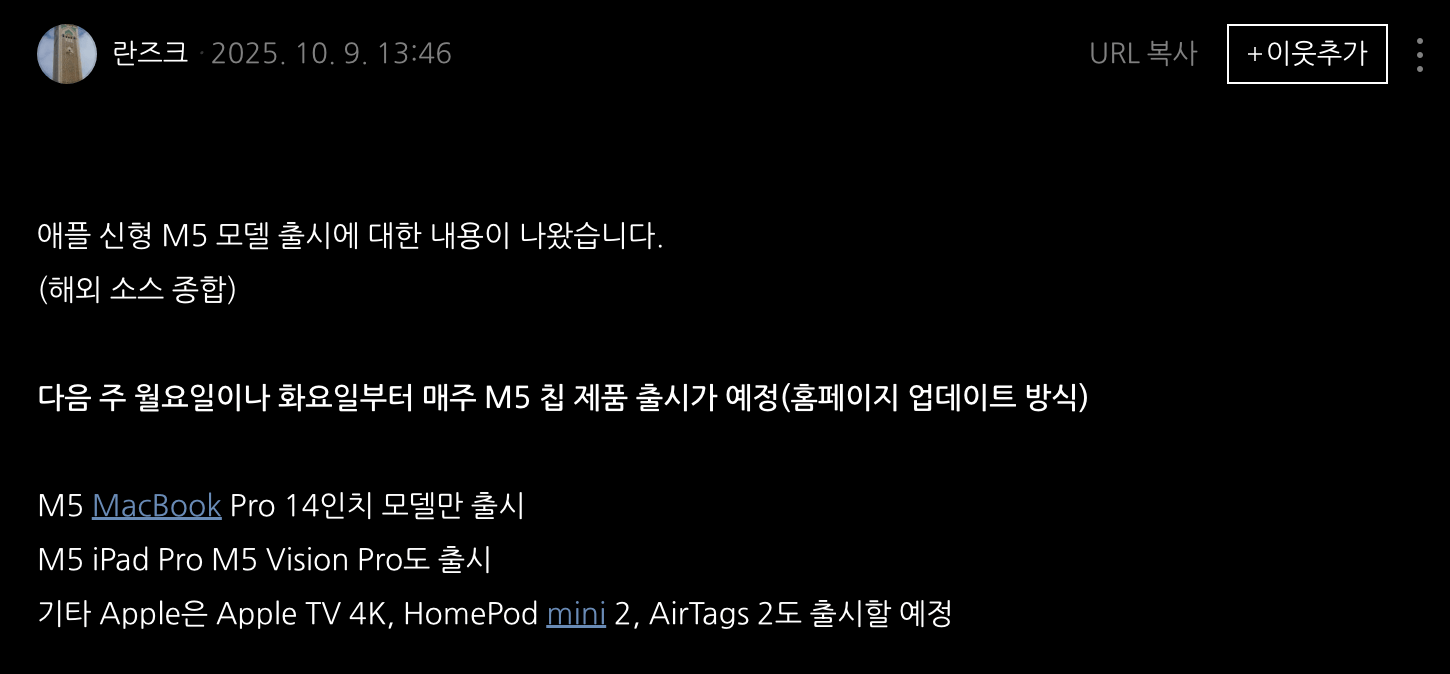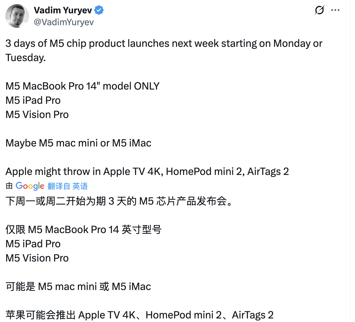 总而言之,搭载 M5 芯片的新品在本月登场已是大概率事件,我们只需耐心等待即可。